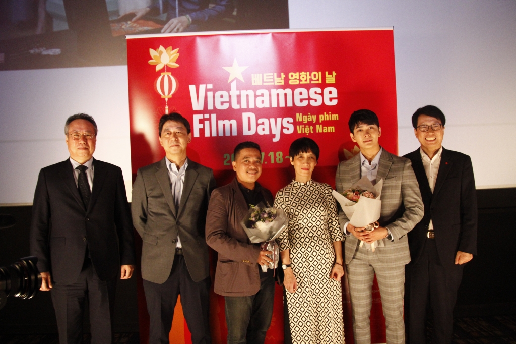 Bà Lý Phương Dung - Phó Cục trưởng Cục điện ảnh cùng đạo diễn Lê Thanh Sơn chụp ảnh cùng đoàn Hàn Quốc gồm ông Oh Seok Guen, Chủ tịch Ủy ban xúc tiến điện ảnh Hàn Quốc; ông Cha Won Chun - CEO công ty Lotte Cinema và nam diễn viên Kang Tae Oh