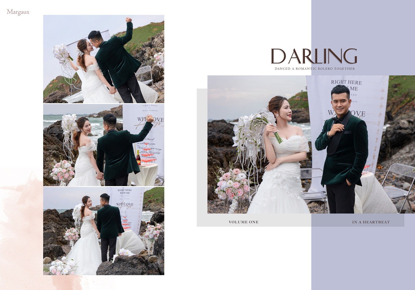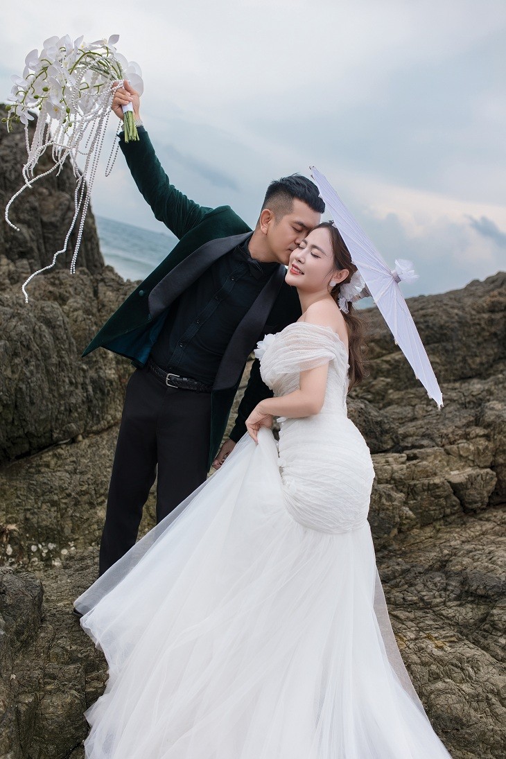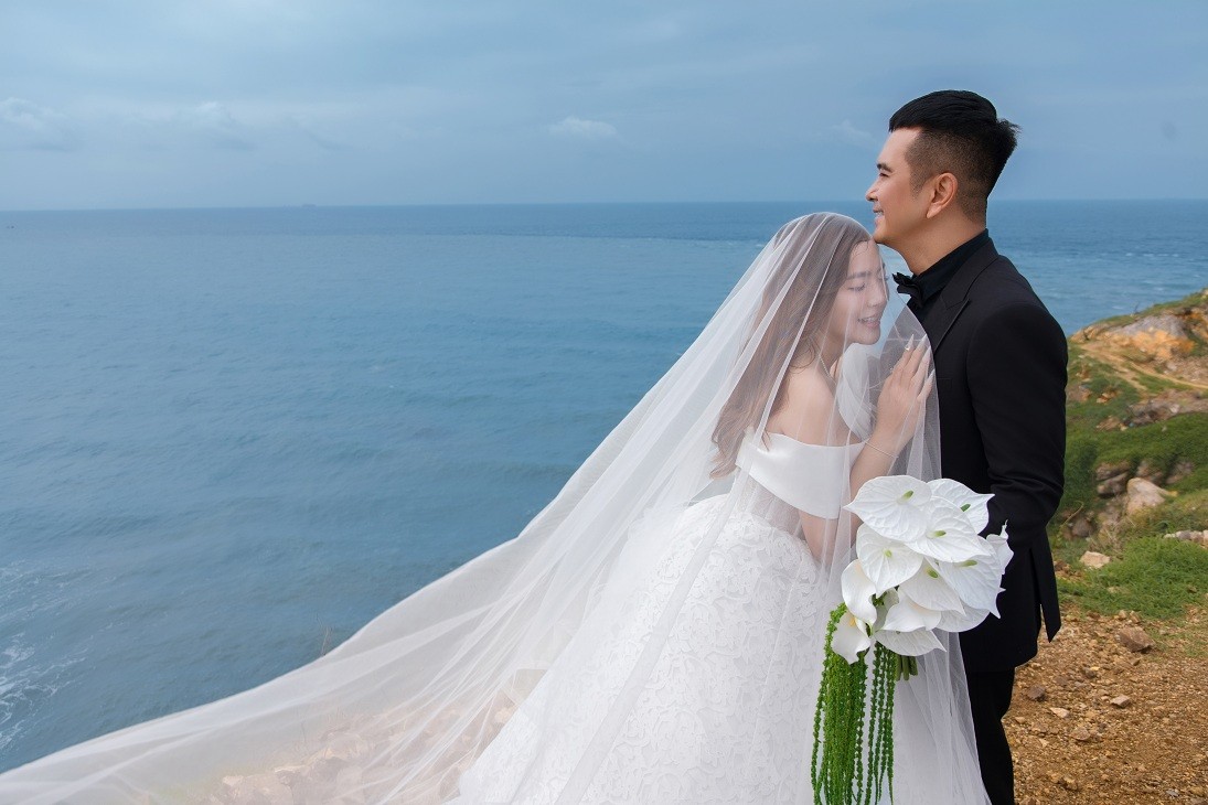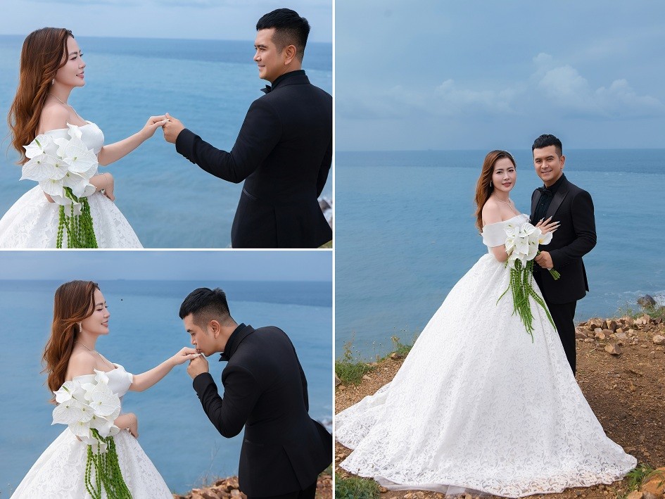 Tại Hồ Cốc - điểm đến nổi bật của Vũng Tàu, cặp đôi lựa chọn khung cảnh biển trời khoáng đạt làm phông nền cho những bức ảnh đầy thi vị. Thanh Tâm xuất hiện duyên dáng trong hai mẫu váy cưới trắng chủ đạo một chiếc đầm bồng xòe mang phong cách công chúa nhẹ nhàng, một chiếc đầm đuôi cá tinh tế tôn dáng. Cả hai thiết kế đều khai thác chất liệu bay bổng và chi tiết ren mềm mại, gợi lên hình ảnh một cô dâu dịu dàng mà vẫn hiện đại. Đồng hành bên cạnh, Hùng Thuận diện vest lịch lãm, tạo nên một tổng thể hài hòa, sang trọng.