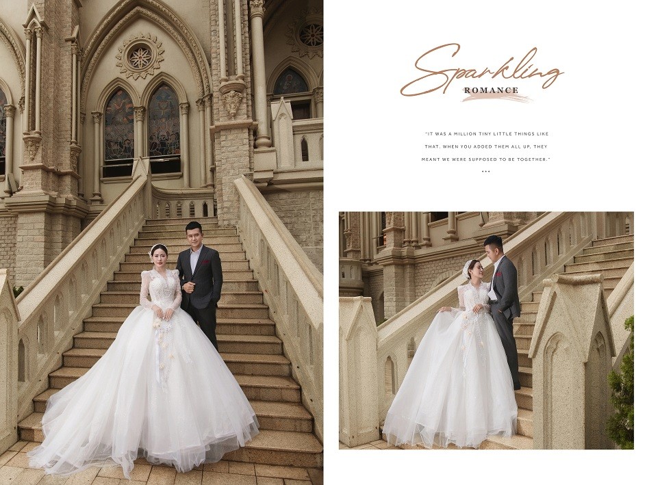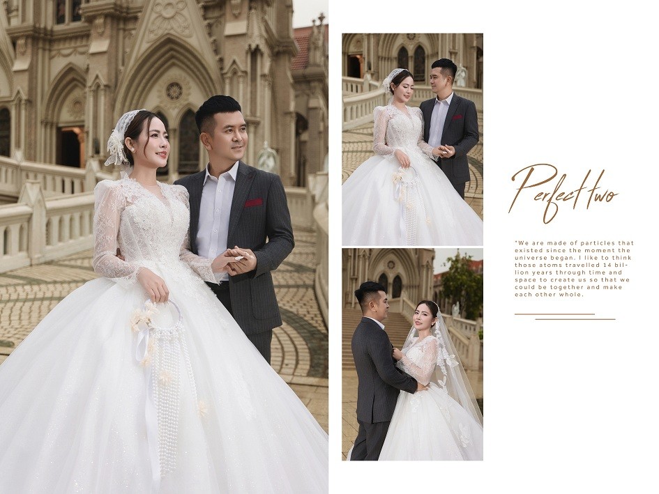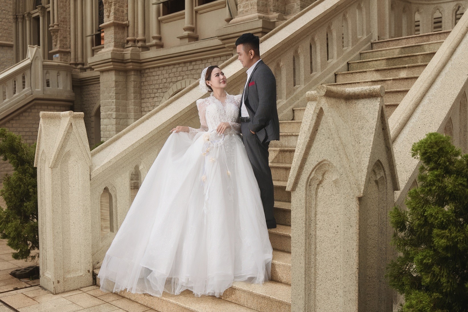 Không chỉ dừng lại ở biển trời Hồ Cốc, cặp đôi còn chọn nhà thờ Song Vĩnh làm điểm dừng chân thứ hai cho bộ ảnh cưới. Tại đây, Thanh Tâm diện bộ váy cưới cổ điển, thanh lịch được xử lý ren thủ công tinh xảo, sánh bước bên Hùng Thuận trong bộ vest tone xám nhã nhặn.