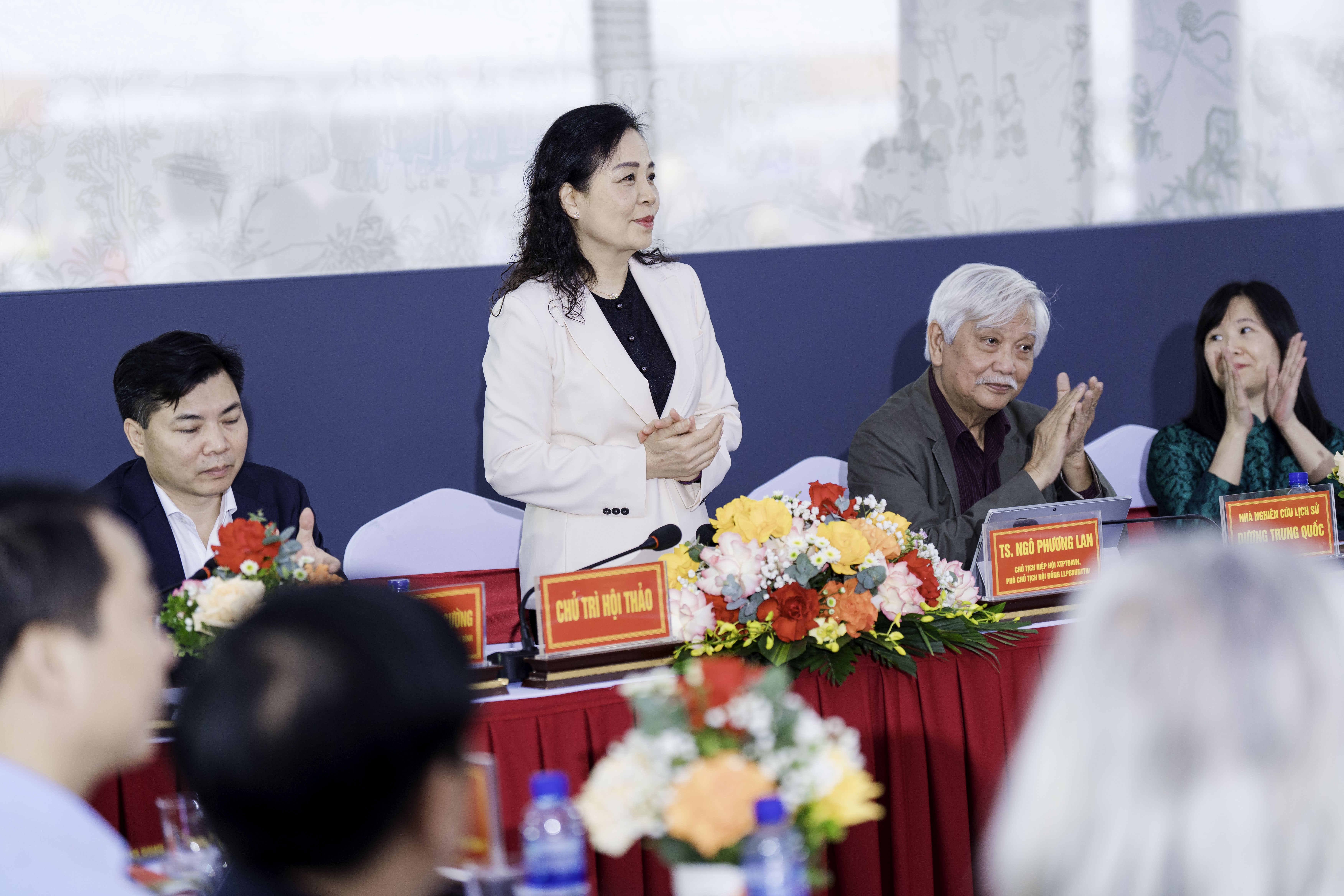 Ngồi trên bàn chủ tọa, TS Ngô Phương Lan - Chủ tịch Hiệp hội Xúc tiến và Phát triển Điện ảnh Việt Nam VFDA phát biểu "Ở thời đại này, tôi nghĩ rằng các nhà làm phim nên tận dụng tất cả mọi thứ: kho tư liệu của các nhà lịch sử, sự sáng tạo của các bạn trẻ và cũng nên tận dụng cả trí tuệ nhân tạo, làm sao để tìm ra một tiếng nói chung và tiếng nói đó phải có sức thuyết phục và đến được với khán giả không những là khán giả Việt Nam mà còn là khán giả quốc tế. Bản thân dự án này, cũng không phải một dự án phim lịch sử mà là dự án phim cổ trang, dã sử. Và phim điện ảnh cũng không phải là tài liệu ghi chép lịch sử, vì vậy nên sự sáng tạo của phim cũng sẽ được tự do hơn rất nhiều. Nếu bộ phim phản ánh được đúng tinh thần lịch sử, hồn cốt lịch sử, phản ánh được tinh thần của dân tộc, của thời đại đó thì cũng rất là hoan nghênh rồi".
