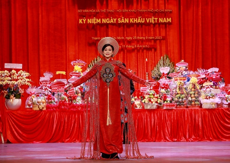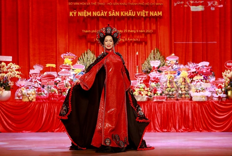 Khắc họa hình ảnh đặc trưng của ngành sân khấu, NTK Việt Hùng đã vô cùng tinh tế và khéo léo khi đưa yếu tố văn hóa dân tộc với những hoa văn, họa tiết đậm nét đặc trưng của sân khấu vào chiếc áo dài, đó là mặt nạ tuồng, mũ mão, chim công… đến hồ điệp (con bướm), những cánh hoa, sóng nước…