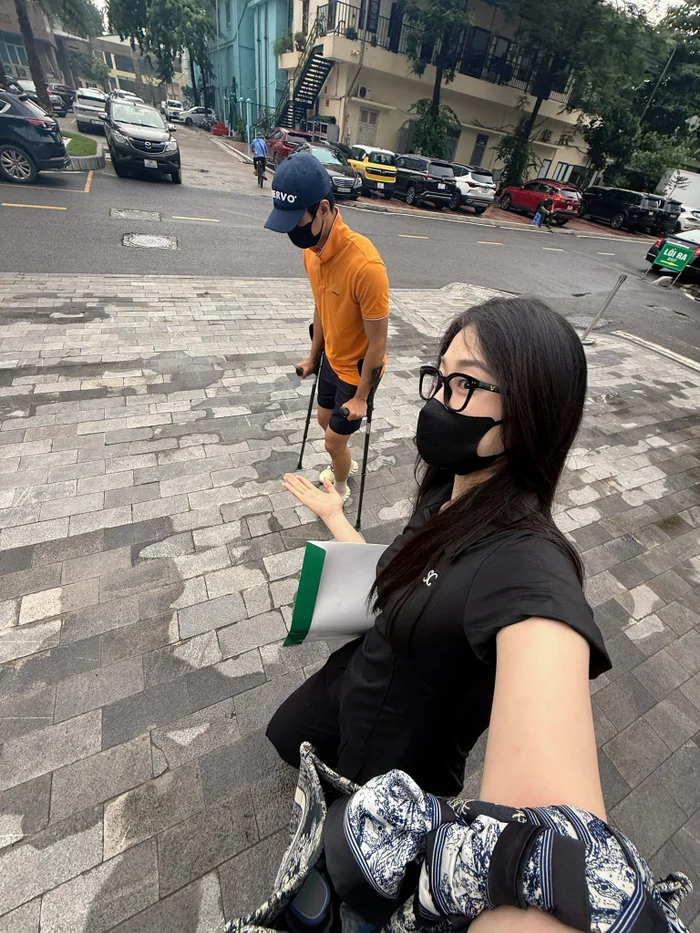 | Dù phải đối mặt với khó khăn trong di chuyển, Bình An vẫn giữ tinh thần lạc quan, nở nụ cười tươi tắn bên Phương Nga. Á hậu cũng thể hiện sự hóm hỉnh khi đăng ảnh kèm dòng trạng thái: "Chào mừng đồng chí áo cam đến với đội tập tễnh, tạm gắn bó với cái nạng đến tháng 9 nhen". |