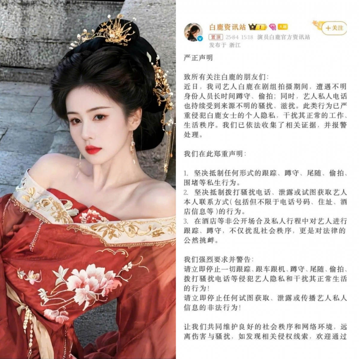 Hành vi này đã xâm phạm nghiêm trọng đến quyền riêng tư và cuộc sống cá nhân của Bạch Lộc, cũng như làm gián đoạn công việc. Studio đã quyết định thu thập bằng chứng liên quan theo quy định của pháp luật và báo cáo vụ việc với cảnh sát. Ngoài ra, phía đại diện của Bạch Lộc cũng kêu gọi chấm dứt mọi hành vi theo dõi, bám đuôi và gọi điện quấy rối nhằm phát tán thông tin cá nhân của nghệ sĩ. Sự việc đã có mặt trên No.1 hotsearch.