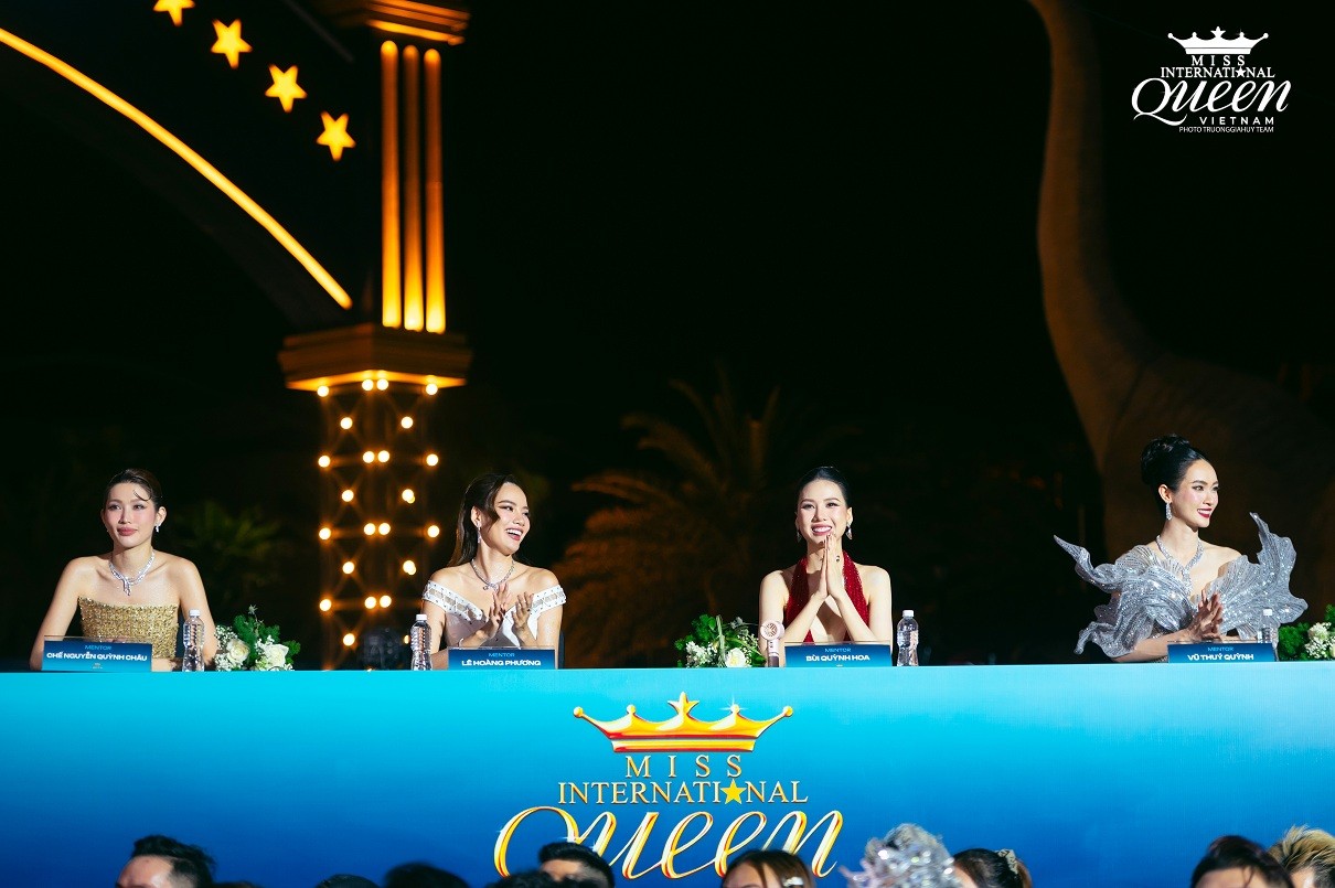 Thảm đỏ đêm chung kết chứng kiến sự xuất hiện của dàn Mentor tài năng của chương trình như: Hoa hậu Bùi Quỳnh Hoa, Hoa hậu Lê Hoàng Phương, Á hậu Quỳnh Châu và Á hậu Thúy Quỳnh. Cùng với đó là sự đồng hành của dàn giám khảo giàu chuyên môn: Dược sĩ Tiến, Hoa hậu Như Vân, Hoa hậu Hương Giang, Nhà sản xuất Huỳnh Như, Siêu mẫu Hà Anh… Chưa dừng lại ở đó, Miss International Queen Vietnam 2025 còn ghi nhận dàn khách mời xịn sò khác, điển hình như: Hóa Trần, Lâm Khánh Chi, TikToker NuChuu, TikToker Mia Lê, Nam vương Hansel Hiển Trần, Á hậu Mai Ngô…