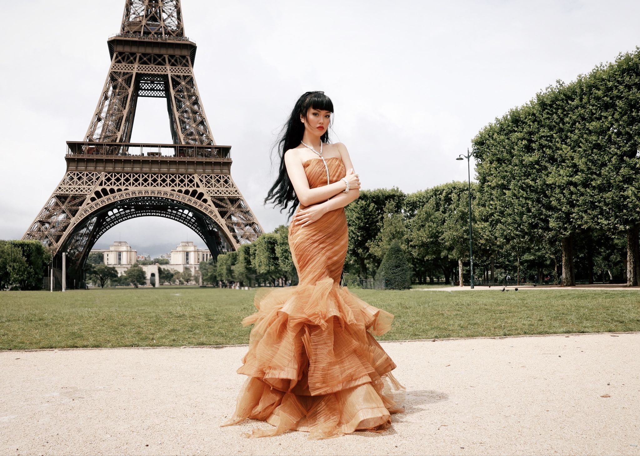 Trước tháp Eiffel biểu tượng, Jessica Minh Anh hóa thân thành vẻ đẹp kiến trúc trong chiếc đầm tulle màu nâu nhạt của La Paix. Chất liệu được tạo hình công phu bằng kỹ thuật xếp vải và hồ vải nhẹ, vừa uyển chuyển vừa giữ được dáng phom – tạo nên một silhouette vừa mộng mị vừa vững chắc.