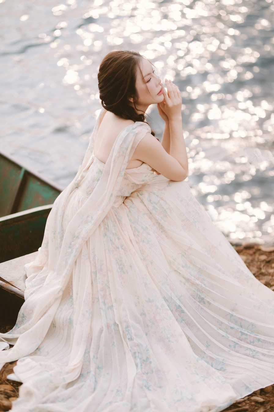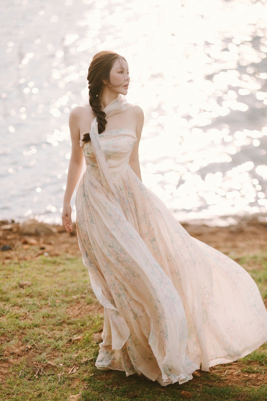 Biển Hồ T'nưng, "đôi mắt Pleiku", mênh mông và xanh biếc, mang vẻ đẹp khoáng đạt và đầy sức sống. Bối cảnh này là nơi lý tưởng để Lý Nhã Kỳ thể hiện sự quyến rũ, phóng khoáng. Cô diện chiếc váy cúp ngực với tà váy dài thướt tha bên mép hồ. Gam màu xanh của bầu trời và mặt nước làm nền hoàn hảo cho tông màu pastel nhẹ nhàng. Hình ảnh Lý Nhã Kỳ đứng bên bờ hồ, mái tóc tết đong đưa trong gió, ánh mắt nhìn về phía mặt nước bao la, tựa như một nữ thần xuất hiện từ làn nước trong xanh, vừa quyến rũ, vừa bí ẩn.