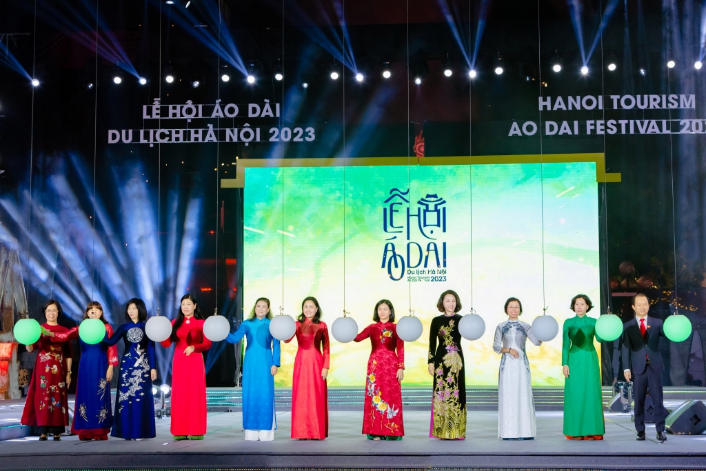 | Phó Bí thư Thường trực Thành ủy Nguyễn Thị Tuyến và các đại biểu nhấn nút khai mạc Lễ hội Áo dài du lịch Hà Nội |