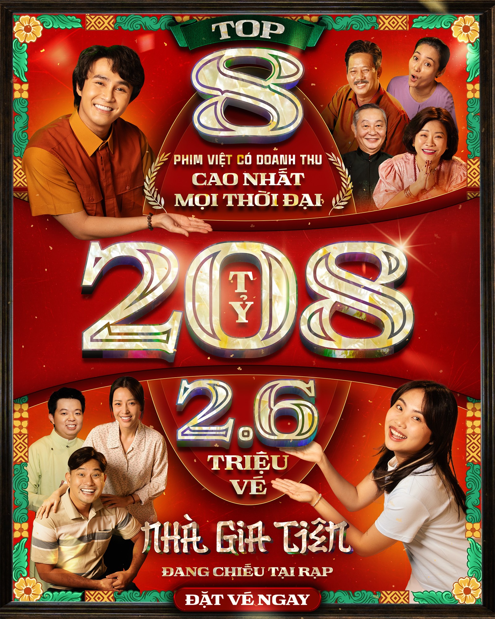 (TGĐA) - Sáng ngày 7/3, phim điện ảnh Nhà Gia Tiên đã chính thức công bố cán mốc doanh thu 208 tỷ đồng với 2,6 triệu vé bán ra, lọt Top 8 phim Việt có doanh thu cao nhất mọi thời đại. Chiều ngày 7/3, để tri ân tình cảm và sự ủng hộ to lớn mà khán giả dành cho bộ phim sau gần 3 tuần khởi chiếu, cũng như nhân dịp ngày Quốc tế phụ nữ 8/3, nhà sản xuất Nhà Gia Tiên tổ chức ngày hội “Bánh xèo của mẹ” từ 16h30 - 20h30 tại Nhà văn hóa Thanh Niên TP. HCM.