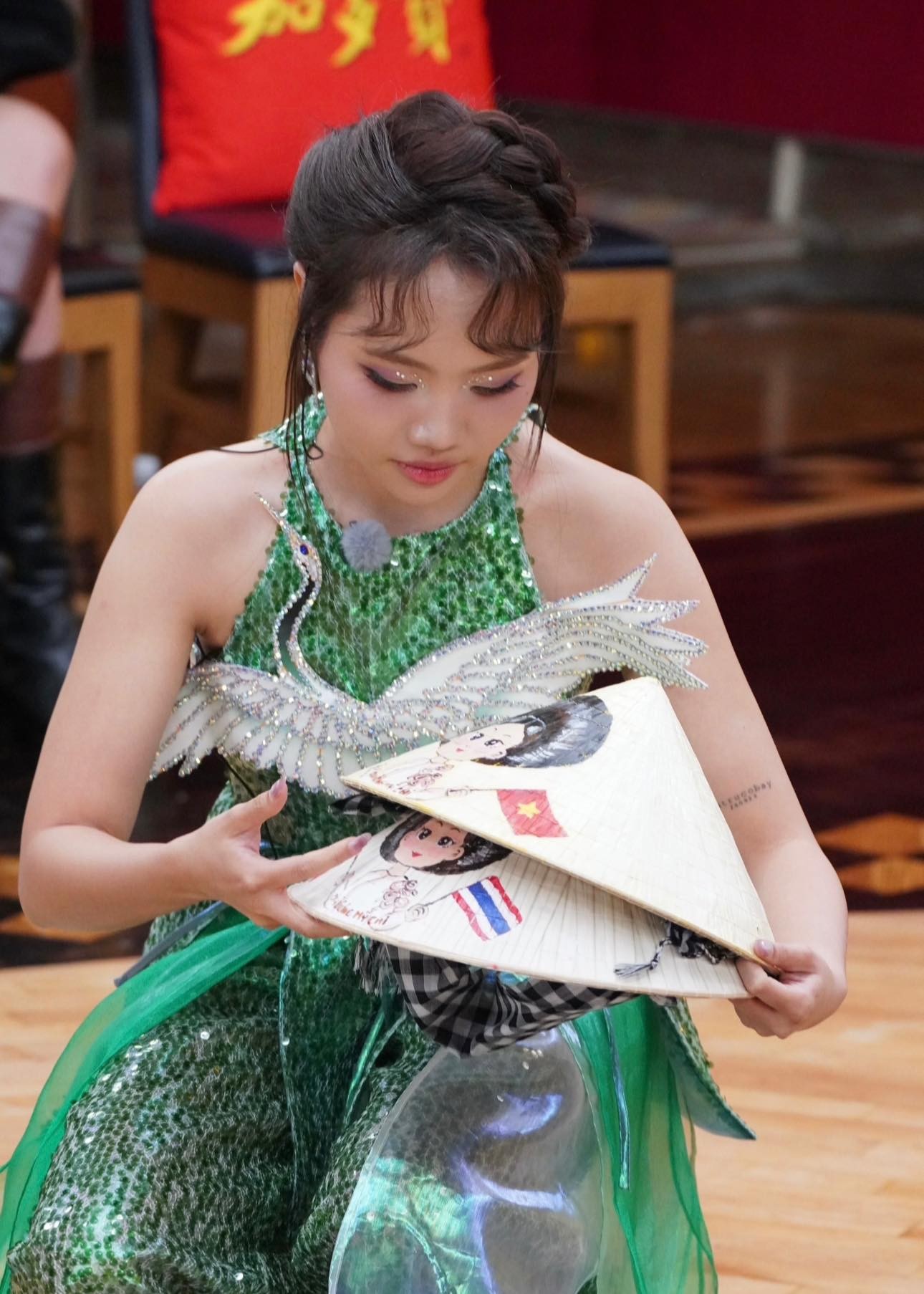 Không chỉ dừng lại ở âm nhạc, yếu tố thị giác trong màn trình diễn của Phương Mỹ Chi cũng gây ấn tượng mạnh. Cô xuất hiện trong bộ trang phục lấy cảm hứng từ áo tứ thân và nón quai thao - hai biểu tượng của quan họ Kinh Bắc. Đặc biệt, hình ảnh con cò - biểu trưng cho sự cần cù, bền bỉ của người Việt được làm nổi bật trên trang phục, tạo nên một tổng thể vừa truyền thống vừa đầy tính nghệ thuật.
