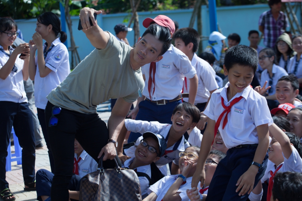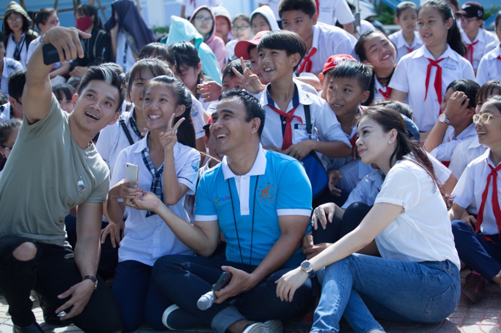 | | Cả 3 nghệ sĩ chụp hình selfie với các em học sinh | |