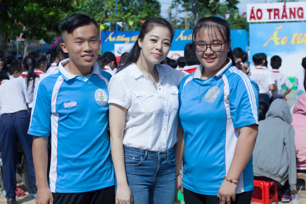 | | MC Quyền Linh và diễn viên Vân Thanh cùng với các em học sinh | |