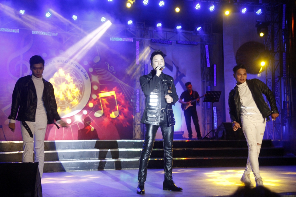 | Ca sĩ Hoàng Phong trình diễn tại sân khấu Trống Đồng sôi động trong ca khúc nhạc Hoa lời Việt Kiếp ve sầu cùng vũ đoàn Sức sống |